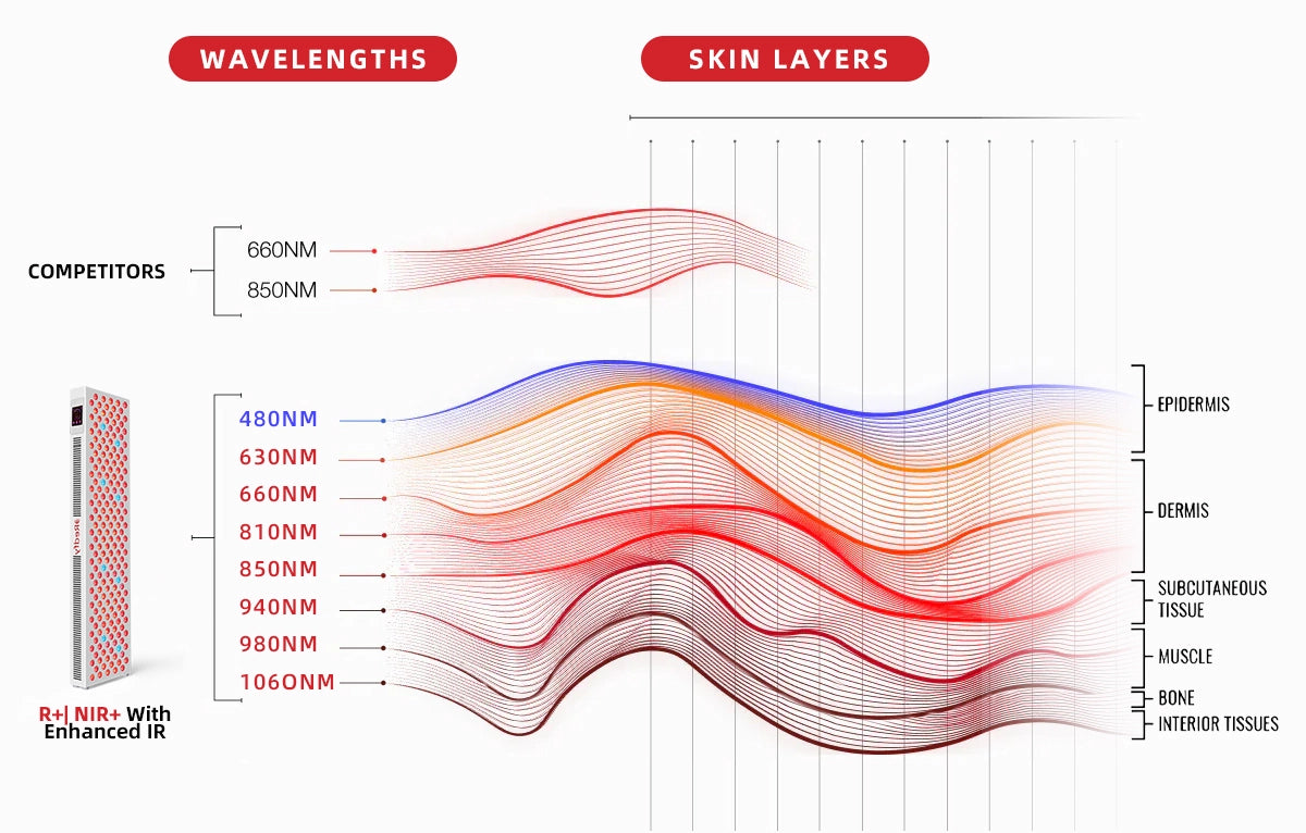 Redvella GlowPanels deliver a full 8-wavelength spectrum (480nm to 1060nm) — scientifically chosen to reach every layer of the body, from the epidermis to deep tissue, muscle, and bone.